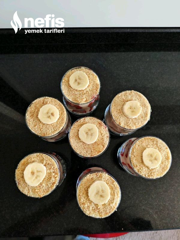 - Muhallebi ekleyip en son üzerini bisküviyle kapatalım isteğe nazaran muzla süsleyelim. Afiyet olsun 🌸.