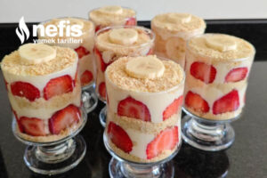 - Kullanacağımız kupların tabana evvel bisküvileri hisse edelim çilekleri ince ince dilimleyip kupların etrafına dizelim .