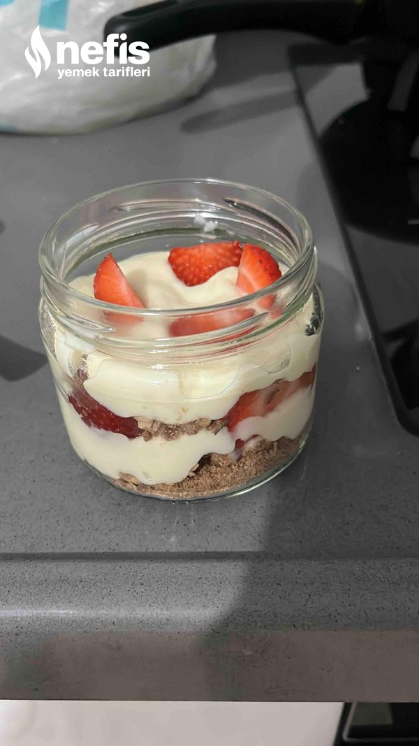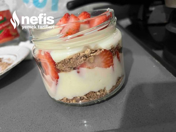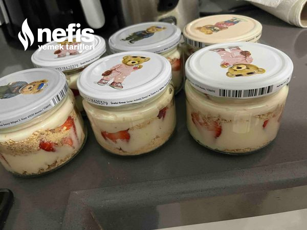 - Çilekten sonra tekrardan bisküvi ve muhallebiyi koyalım son etap olarak en üst kata 4 adet çilek koyup kavanozu kapatalım. Şimdiden afiyet olsun.