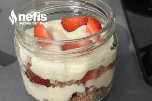 - Çırptıktan sonra kavanoza birinci olarak bisküviyi sonra muhallebiyi koyalım muhallebiden sonra kenarlara çilekleri koyalım.
