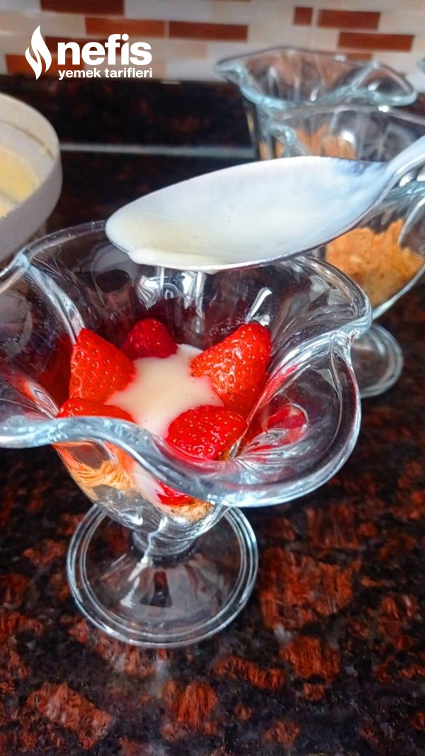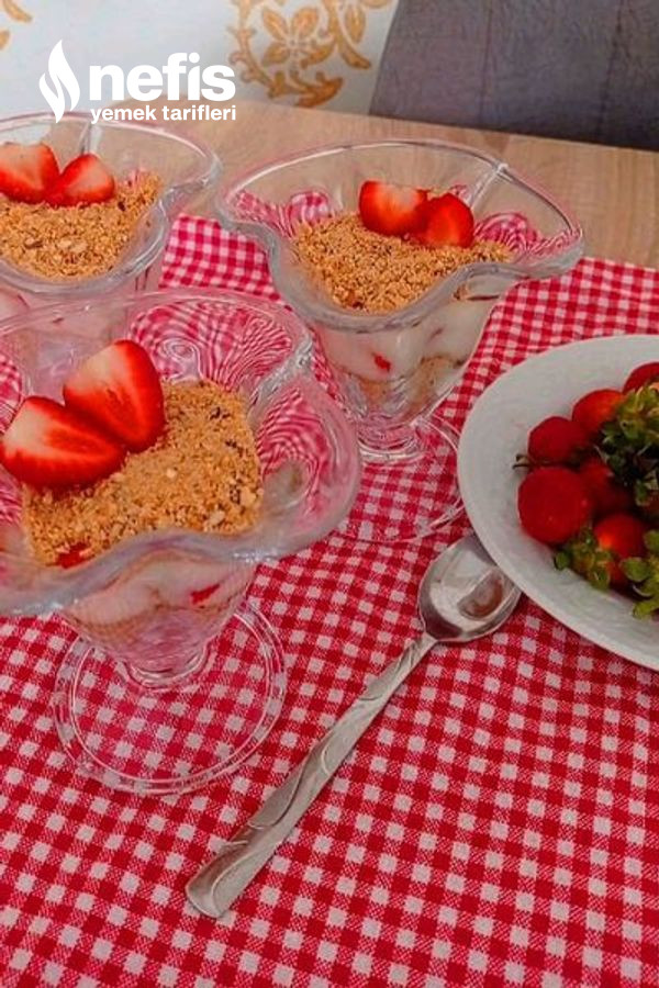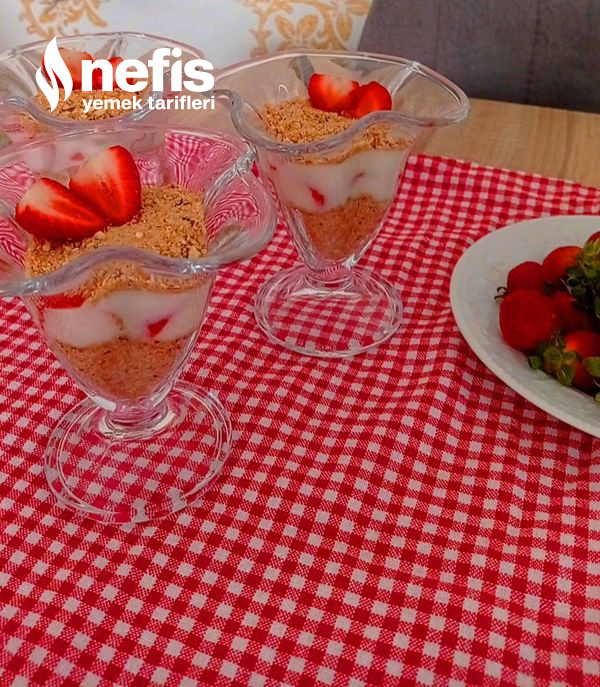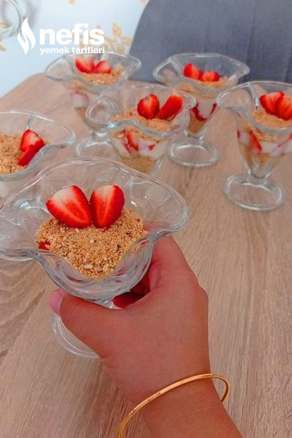 - Magnolia kuplarımızın birinci evvel biraz bisküvili fındıklı karışımı yerleştirelim ve kaşığın art kısmıyla düz bir taban elde edelim kupların kenarına 2 ye böldüğümüz çilek yahut muz dizelim.