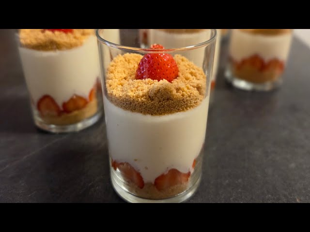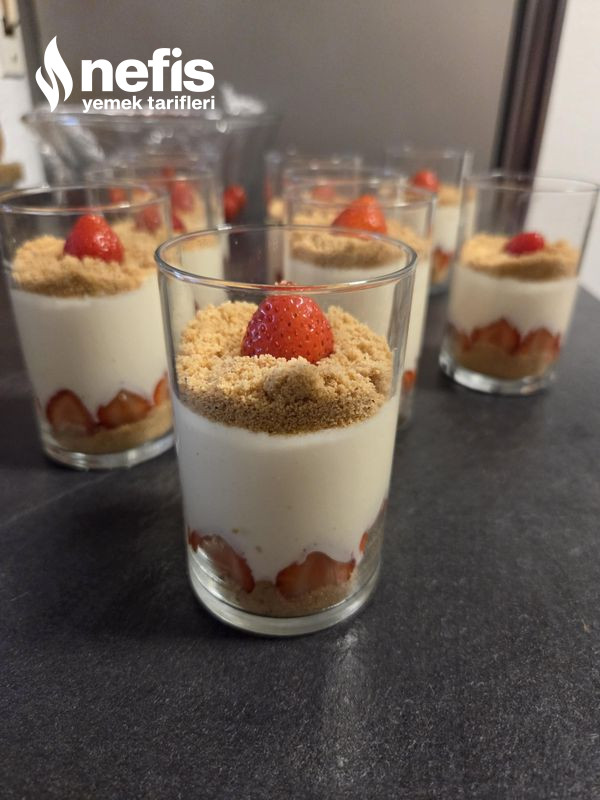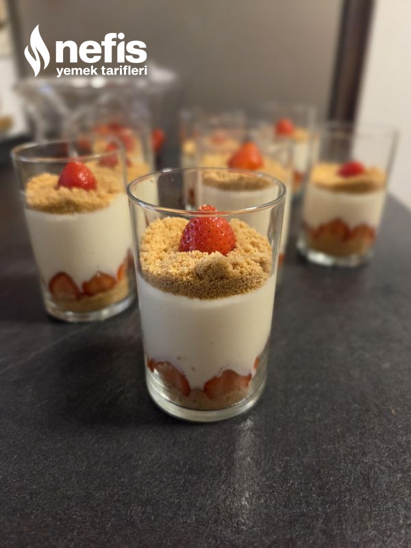 - Üzerine muhallebiyi de dökelim son olarak tekrar üzerine bisküvi karışımını koyup bir adet tam çilek ile süsleyip buzdolabına kaldıralım.