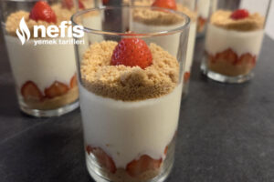 - Üzerine muhallebiyi de dökelim son olarak tekrar üzerine bisküvi karışımını koyup bir adet tam çilek ile süsleyip buzdolabına kaldıralım.