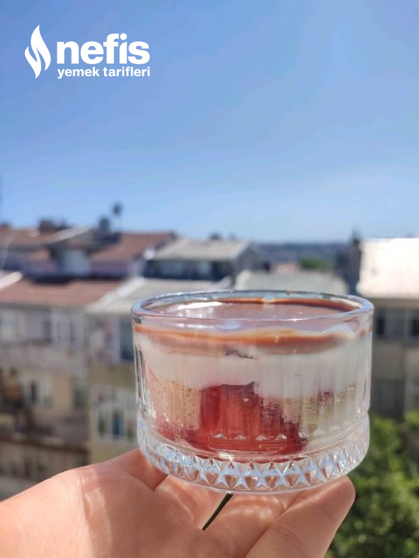 3. Sonra bir kepçe yardımıyla kaselerimize koyalım,robottan geçirdiğimiz bisküviler den ekleyip, küp küp doğranmış çileklerden ortasına koyup tekrardan krema koyalım.