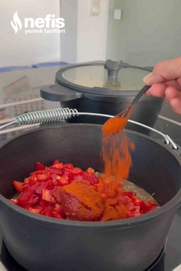 - Domates salçası, toz kırmızı biber ve tuzu ekleyip tekrar karıştırın.