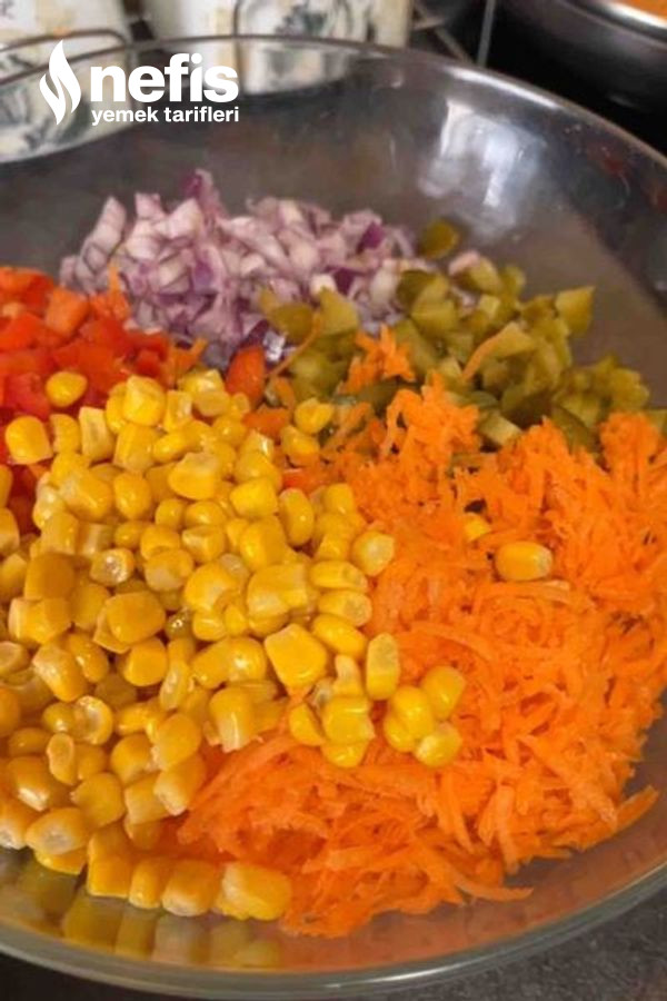 - Soğuyan makarnayı derin bir kabın içine alın üzerine bütün zerzevatları ek edin.