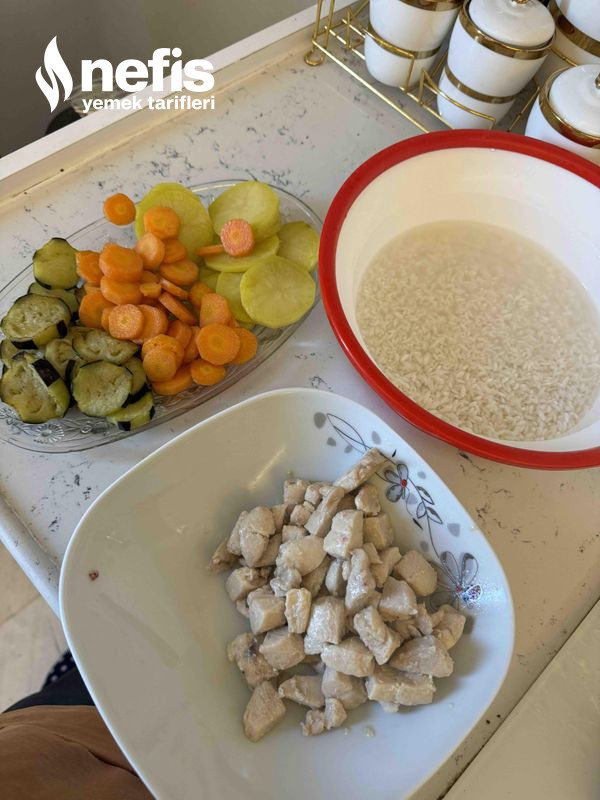 5. Uygun bir tencereye tavukaları en alta üstüne havuç, üstüne patates ,üstüne patlıcanlara dizin, deliksiz formda dizin.