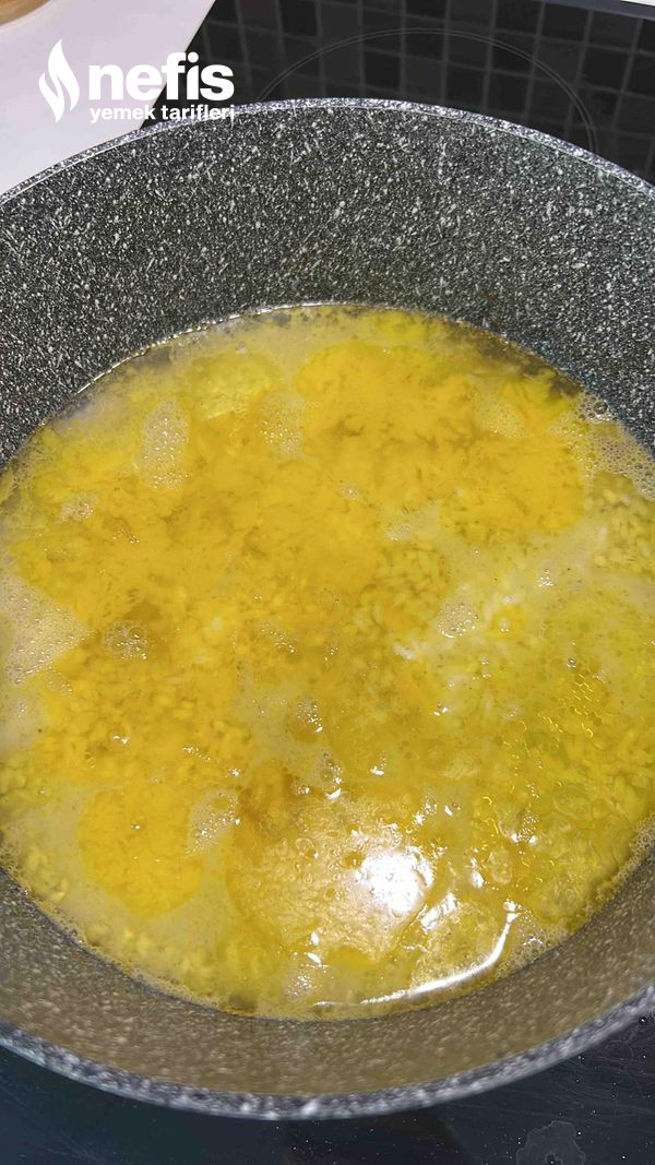 4. En alta et, üzerine pirinçin yarısını, küp küp tereyağını ve tuz ekleyelim.