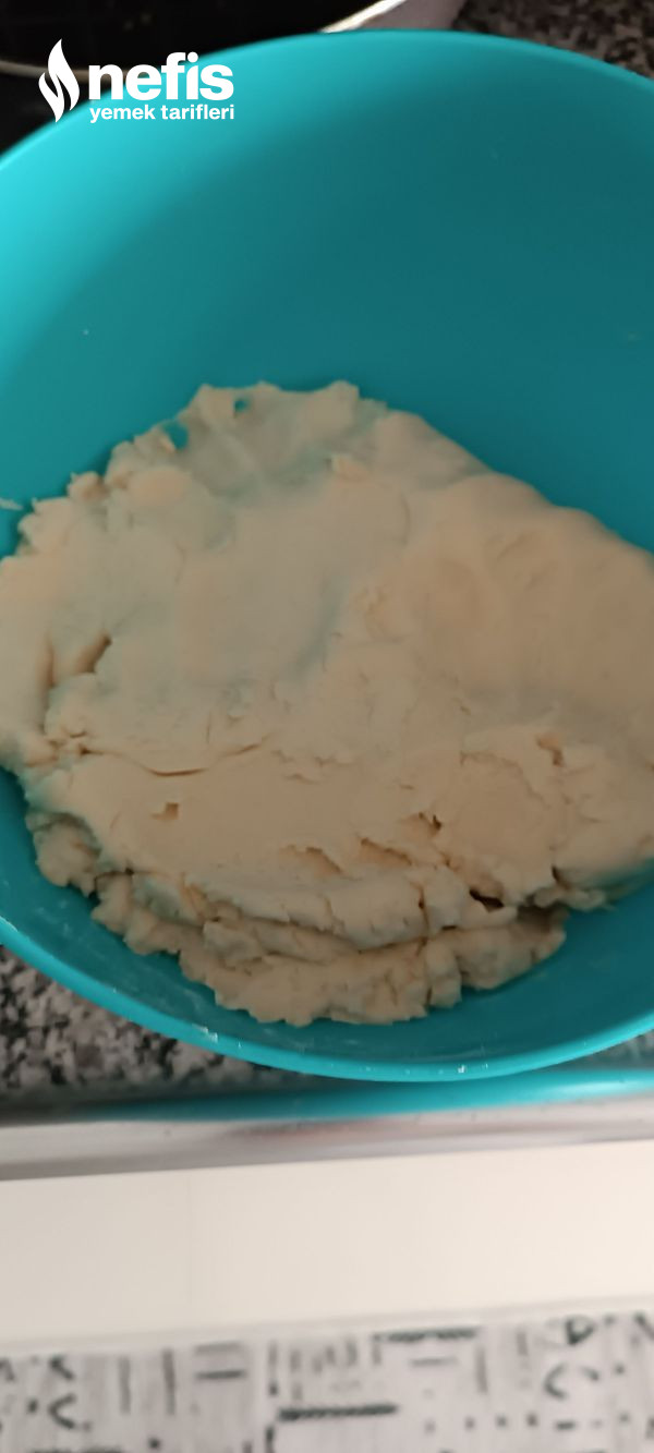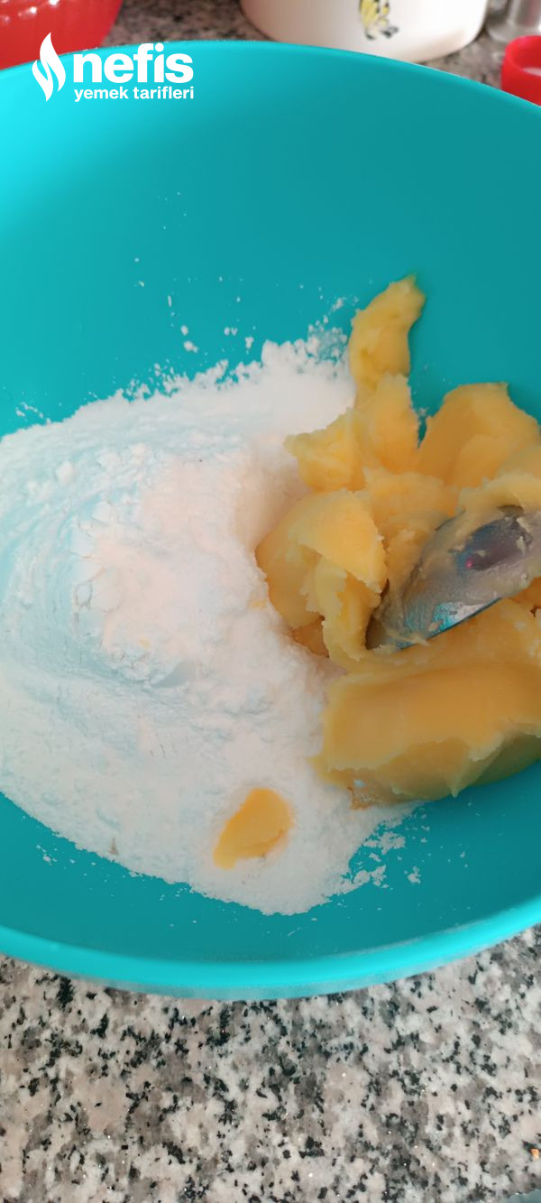1. Yağ ve pudra şekerini karıştırıp unun ek edelim, ele yağışmayan yumuşak bir hamur yapalım.