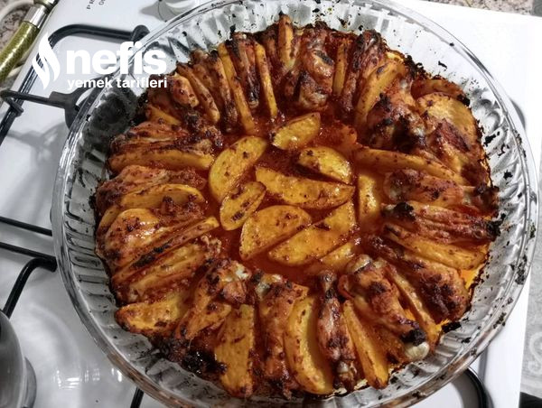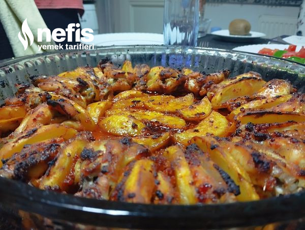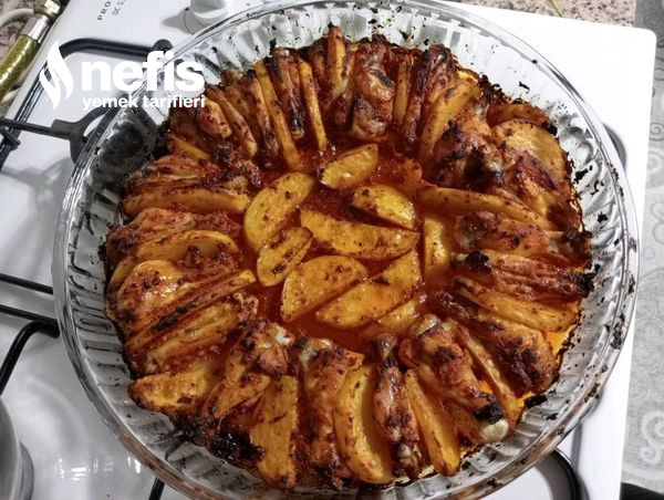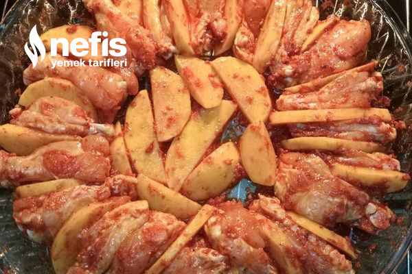 - Kanatlar-butlar ve elma dilim patatesler uygun kapta soslanir. Tepsiye dizilir.