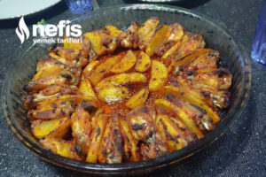 - Kanatlar-butlar ve elma dilim patatesler uygun kapta soslanir. Tepsiye dizilir.