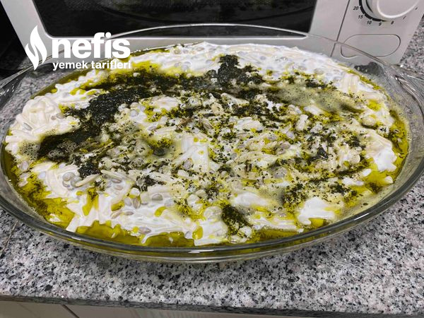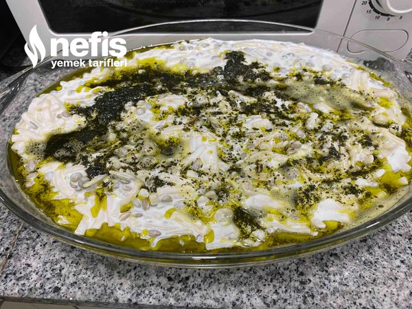 - Sos için bir kase yoğurt, rendelenmiş sarımsak ve tuz ek edip karıştıralım.