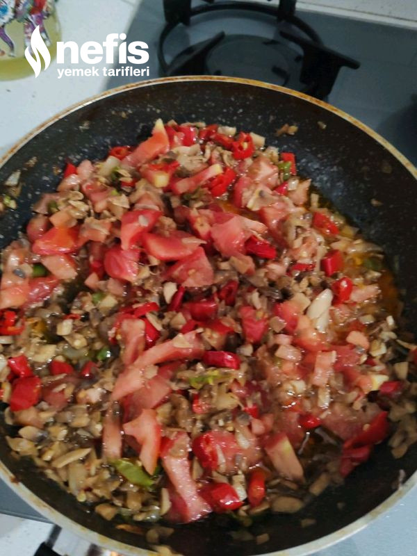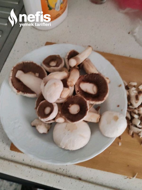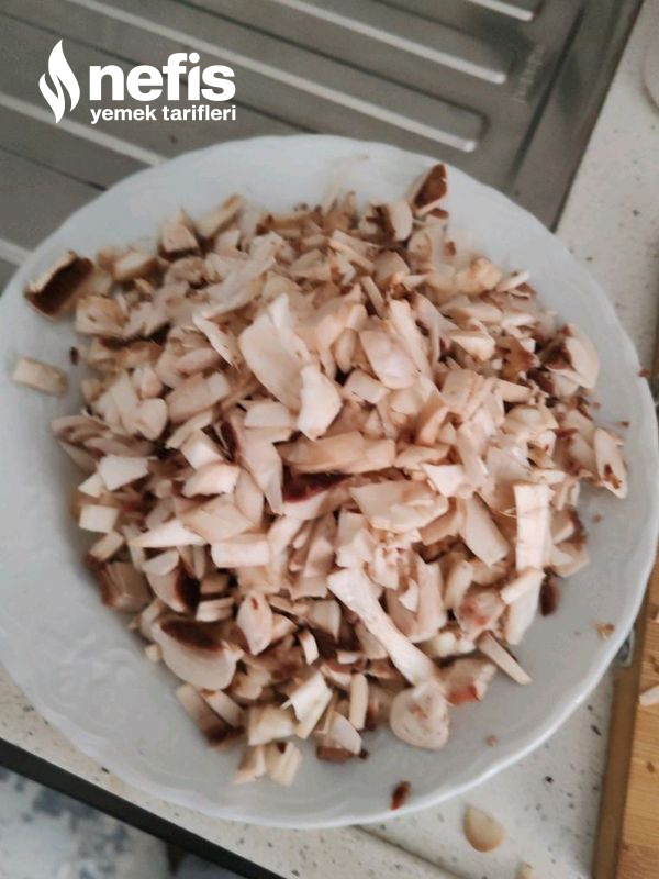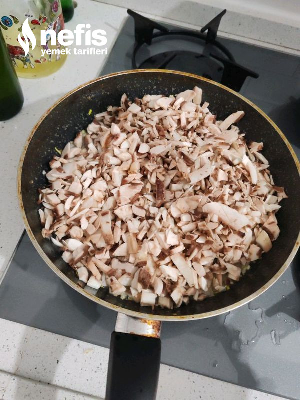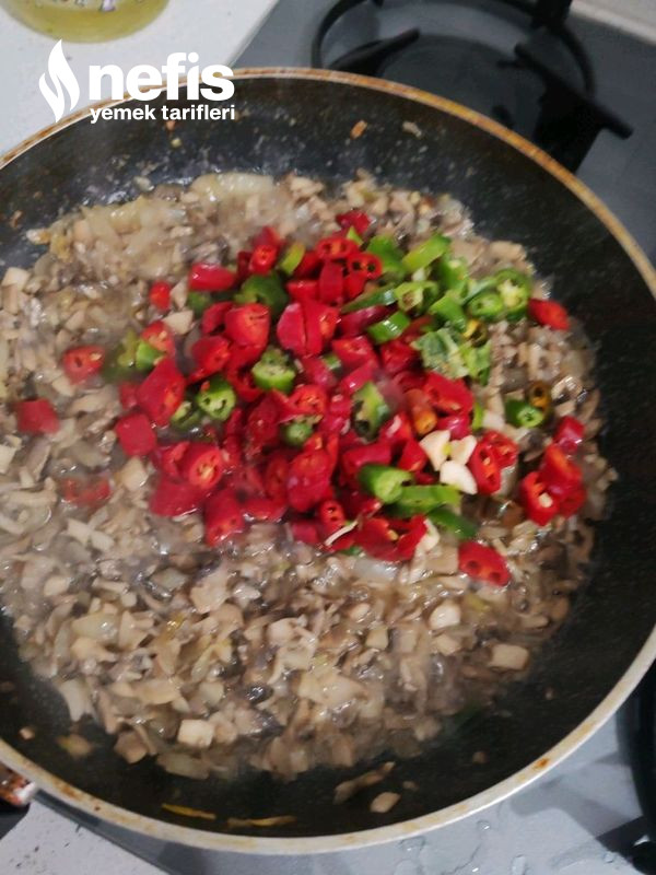 - Mantarı küçük küçük doğrayalım, soğan kavrulunca üzerine mantarı ekleyelim biraz kavrulunca yemeklik doğranmış biberi ve tereyağını ekleyelim, karıştıralım.
