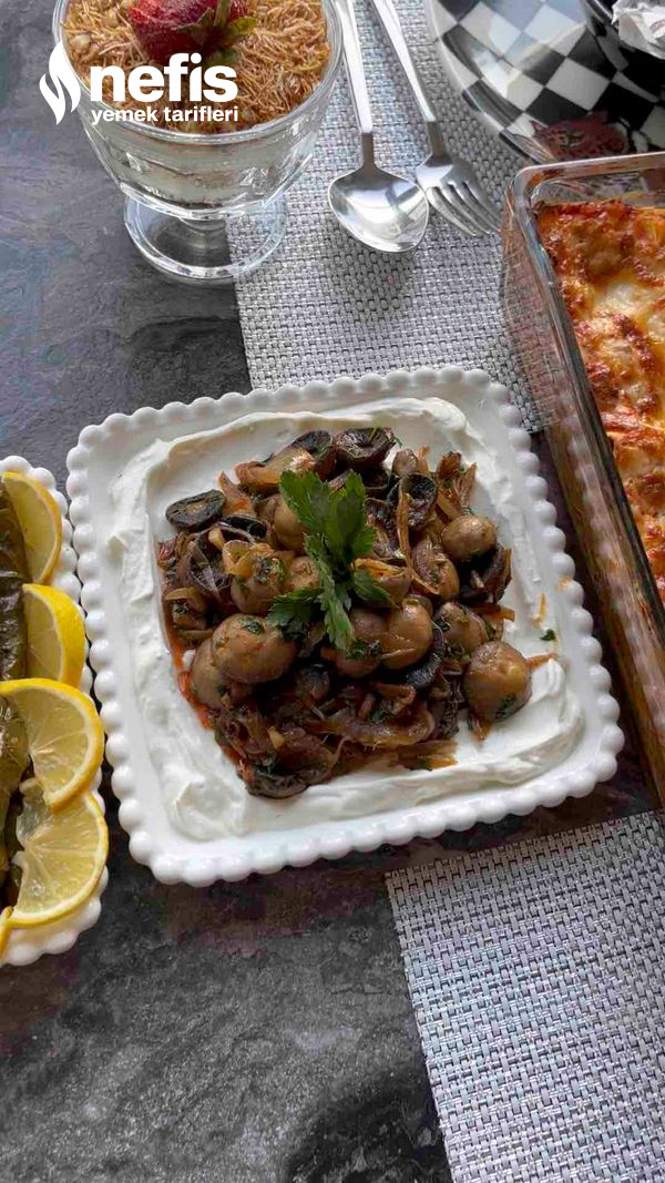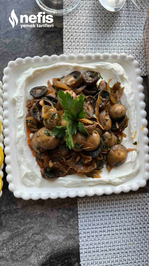 - Yoğurt tabanı için yoğurt labne sarımsak ve tuzu karıştırıp tabağa yayalım üzerinede mantarlarımızı ekleyelim afiyet olsun.