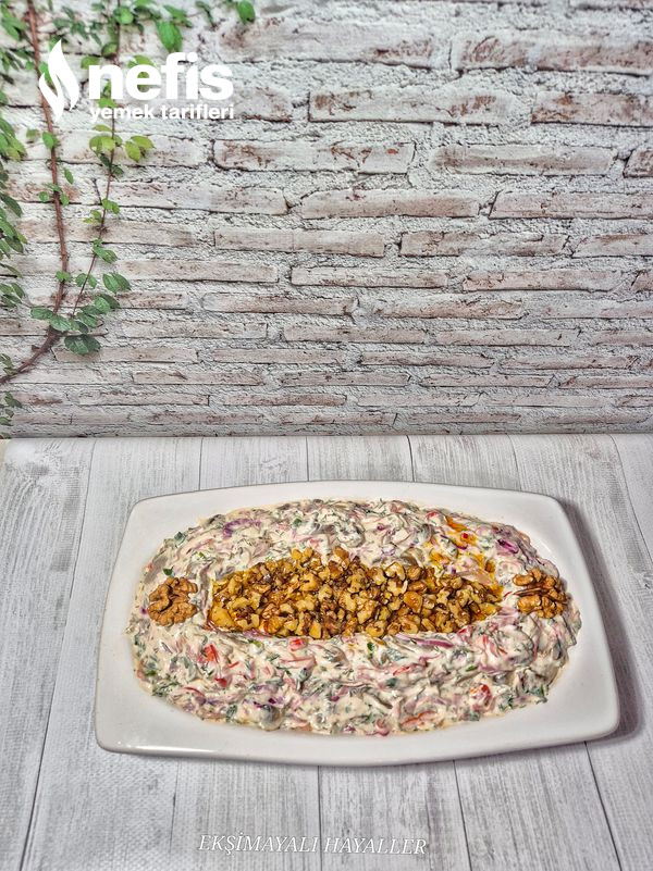 - 250 gram süzme yoğurt 100 gram olağan yoğurt, 50 gram labne, 40 gram mayonez, 1 çay kaşığı kuru fesleğen, 7-8 kısım dereotu, ince kıyılmış, 7-8 kısım maydanoz ince kıyılmış, 5 gram tuz bir kasede yeterlice karıştırılır.