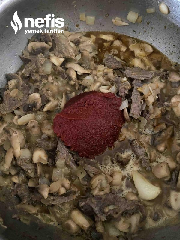 - Ardından tereyağını ekleyip yaklaşık 1-2 dakika kavurmaya devam edelim. Ve mantarlarımızı ek edelim. Gerektikçe yağ ekleyebilirsiniz. Ve salçamızıda ekleyelim bütün gereçler kavrulduktan sonra üzerine iki bardak su ek edelim.