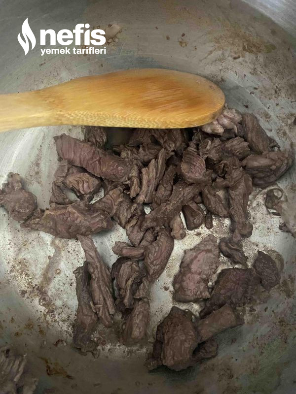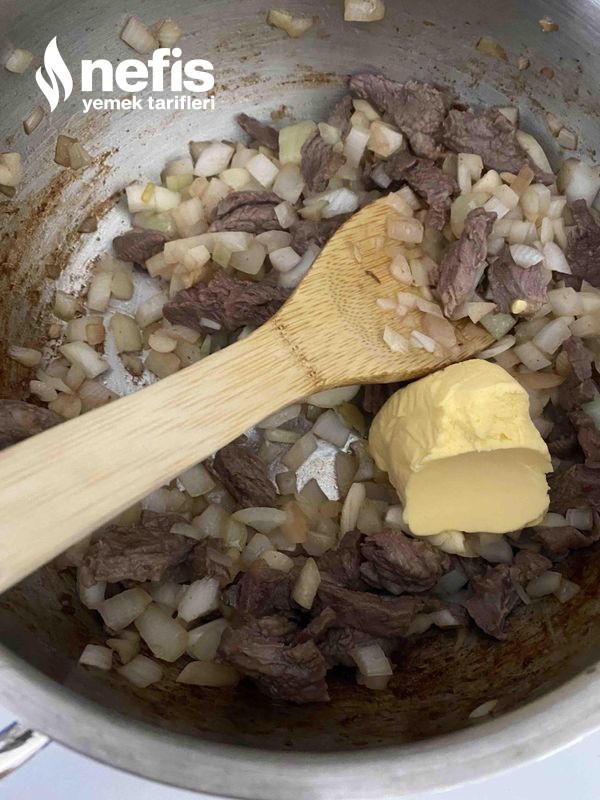 - Ayrı bir tencerede etlerimizi mühürlemeye başlayalım. Yağsız tencereye etlerimizi alıp kavurmaya başlayalım. Sularını salıp çeken etlerimizi rengi dönünce kestiğimiz soğanlarımızı ekleyelim.