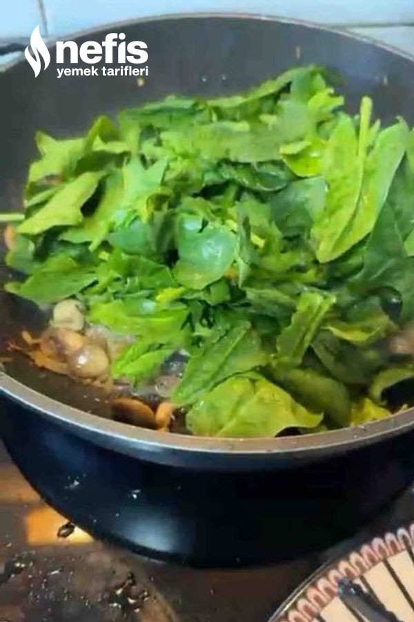 4. Aynı tavanın içine dört yemek kaşığı sıvı yağ ekleyip soğan ve sarımsağı hafif soteleyin akabinde mantarları ekleyip rengi dönene kadar sotelemeye devam edin ıspanakları ekleyip baharatları ek edip hafif soteleyin.