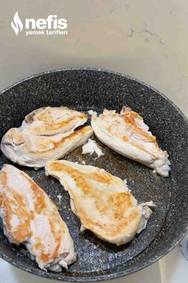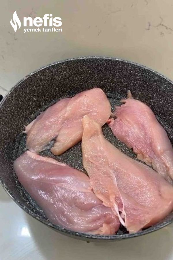 - Göğüs etini uzunlamasına gerçek ortadan ikiye bölüyoruz. Tencereye alıyoruz ve yüksek ateşte önlü gerili kızarana kadar pişiriyoruz.