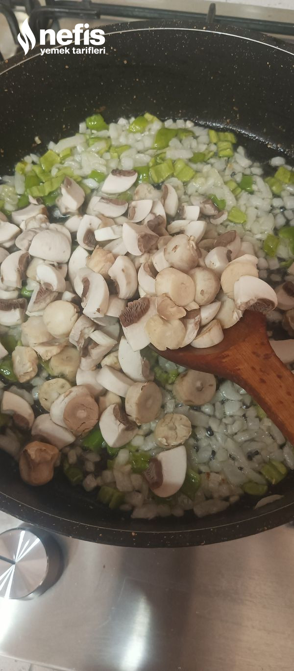 - Kavrulan soğan ve biberin üzerine doğranmış mantarlarımızı döküyoruz mantarlar suyunu çekene kadar kavrulucak.