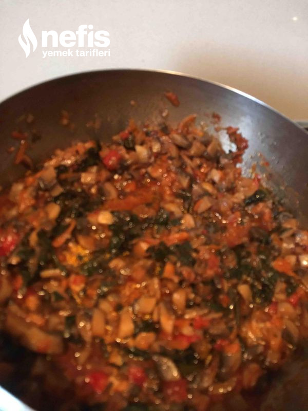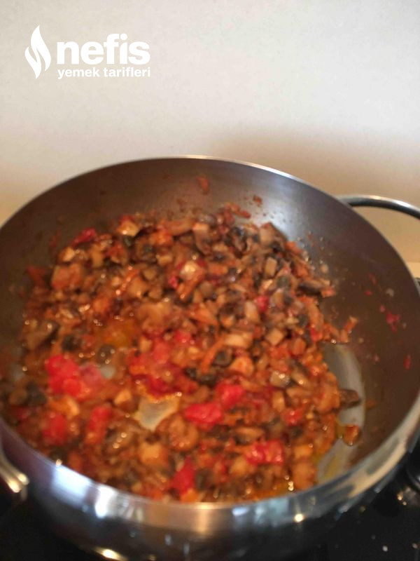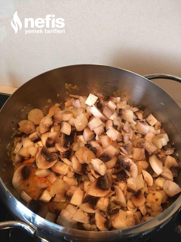3. Küp formunda doğranmış mantarlar eklenerek suyunu salıp çekmesi sağlanır.