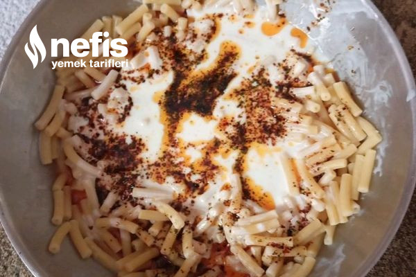 4. Makarnanızı bir tabağa alın, üzerine çırpmış olduğunuz yoğurdu ekleyin .