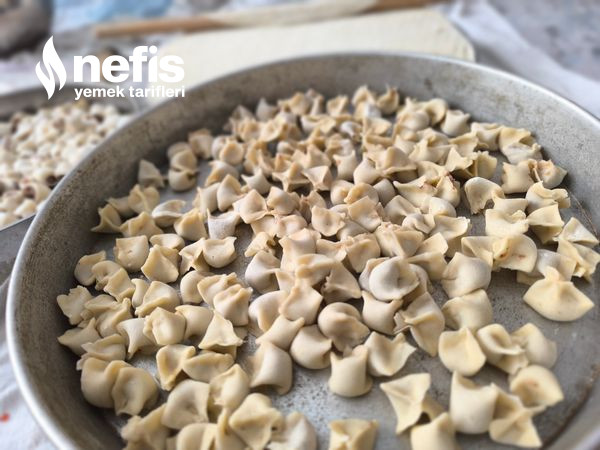2. 10 dakika kadar dinlendirdikten sonra bezeleri açıyoruz açarken ne çok ince ne çok kalın orta kalınlıkta bir hamur elde ediyoruz (fazla un serpmeden açmaya ihtimam gösterin unu fazla serperseniz kapatırken sorun yaşarsınız) ben aparat kullanmadım küçük şeritler halinde kesip içine harçını koydum olağan mantı formunu verip kapattım.