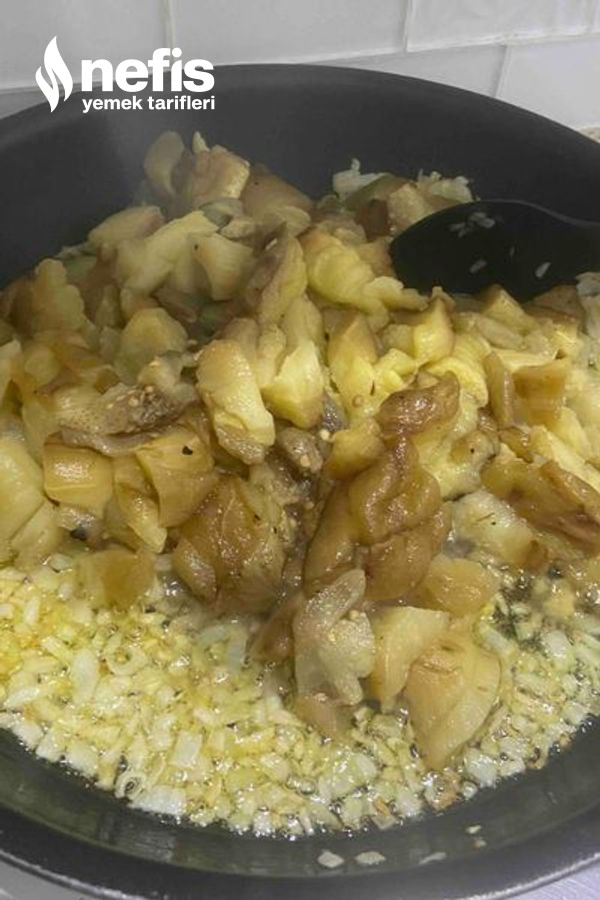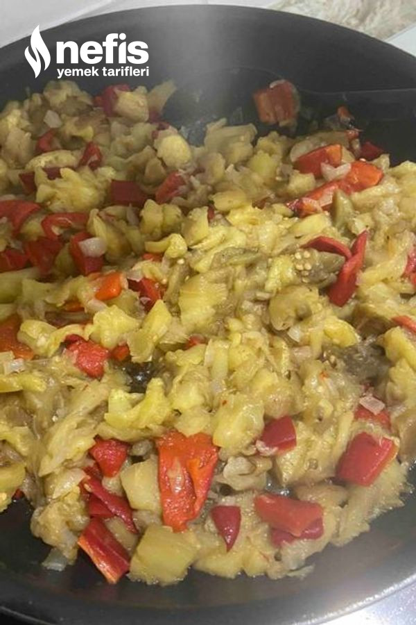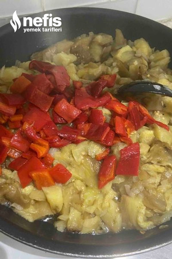 - Soğanı zeytinyağında kavurup közlenip, doğranmış patlıcan ve biberleri ek ediyoruz, tuzunu serpip biraz kavurunca kenara soğumaya alıyoruz.