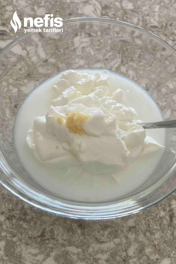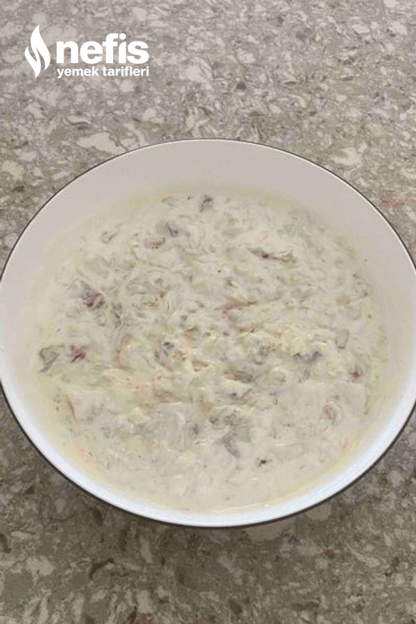 - Yoğurda sarımsağı ,mayonezi ,tuzu ek edip suyu katıp yoğurdu açıyoruz ve patlıcanın üzerine döküp karıştırıyoruz.