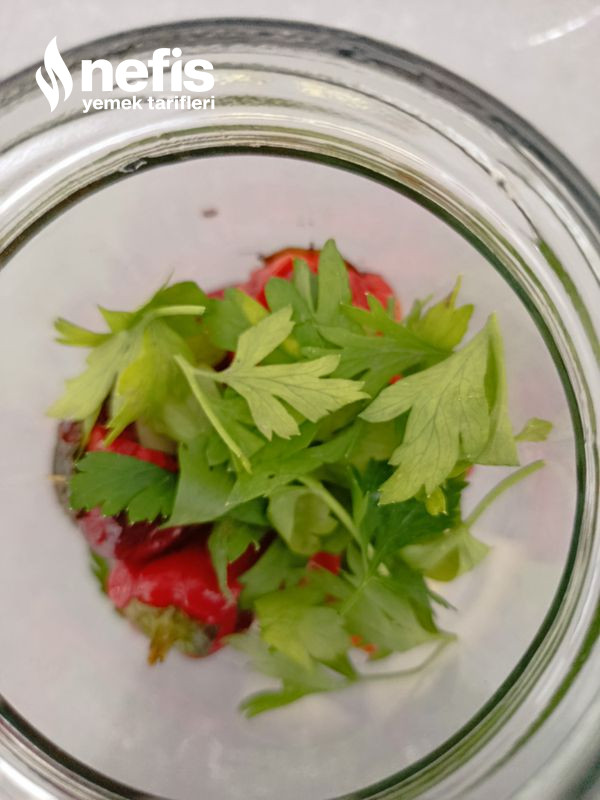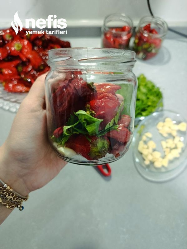 - Kavanozlara biberleri koyalım ortada kalacak biçimde sarımsak ve maydanoz koyup tekrar üstüne tekrar biber koyalım.