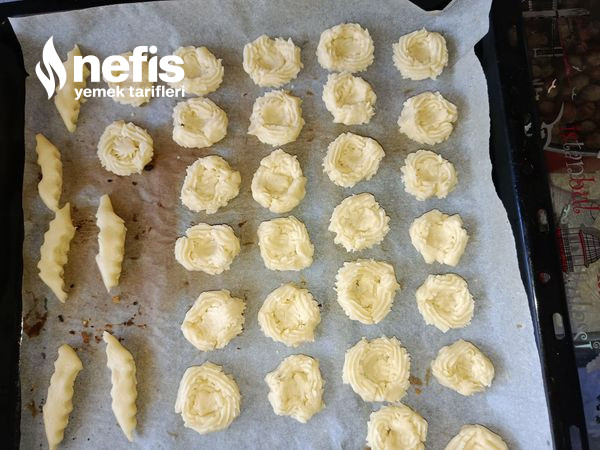3. İsterseniz uzun tırtıl biçiminde isterseniz gül biçimi vererek fırın tepsisine aralıklı olarak sıkalım.