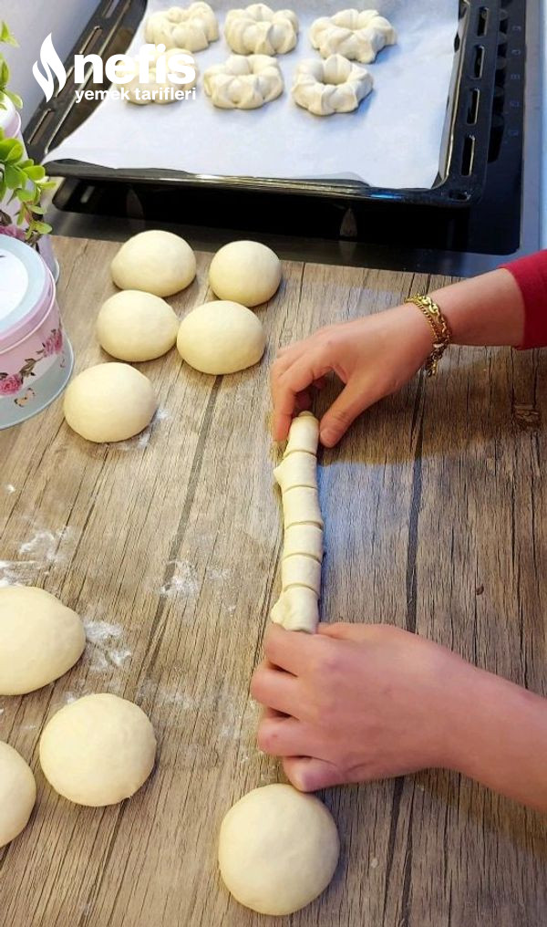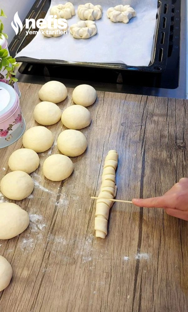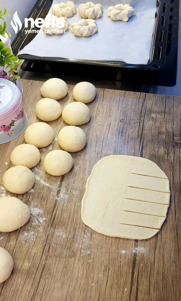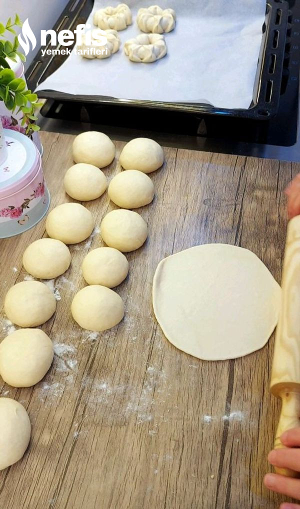 3. Üzerini örterek 30 dakika hamuru mayalandıralım ,mayalanan hamuru 12 eşit bezeye bölelim ve yuvarlayarak 5 dakika dinlendirelim.