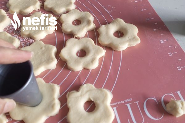 - Çiçek halindeki kalıp ile açtığımız hamuru keselim ortasına delik açalım ben bunun için tırtıl kurabiye kalıbını kullandım.