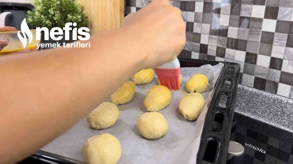 5. Pişirme kağıdı serdiğimiz tepsimize poğaçaları dizelim.