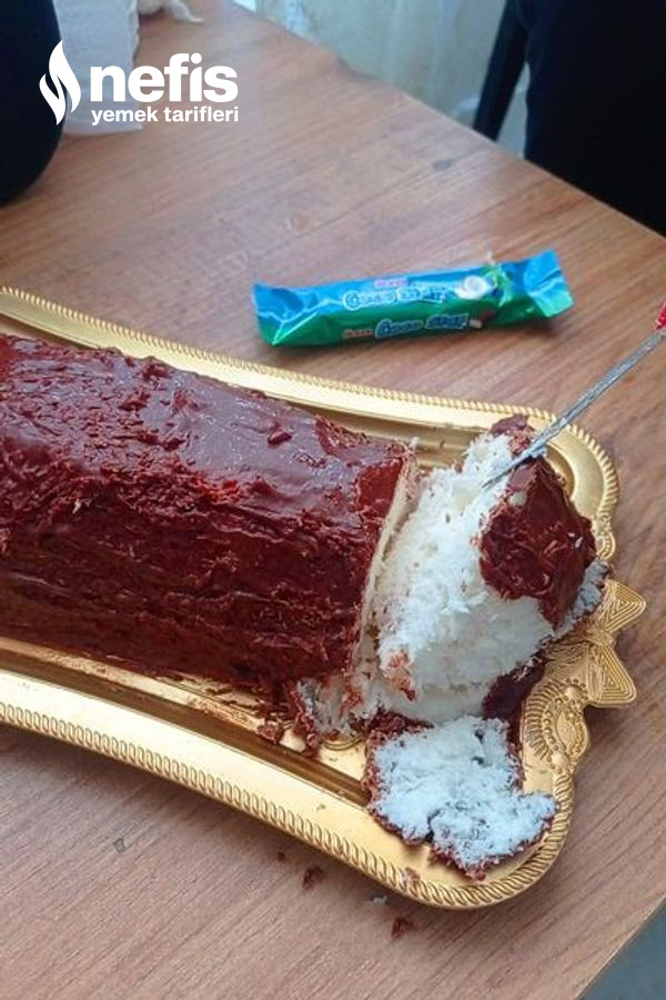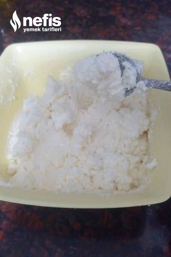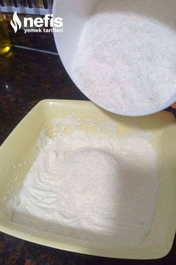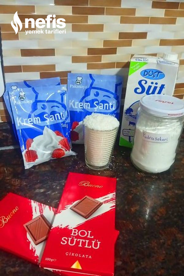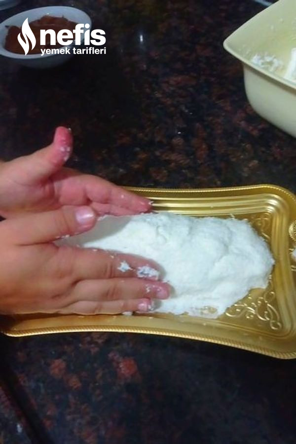 - Daha sonra pudra şekeri ekleyip tekrar çırpalım ve son olarak da hindistan cevizi ekleyip 1-2 tıp daha çırpalım ve üzerine streç sinema geçirerek çikolata eritene kadar 5 – 10 dk buzdolabında dinlendirelim.