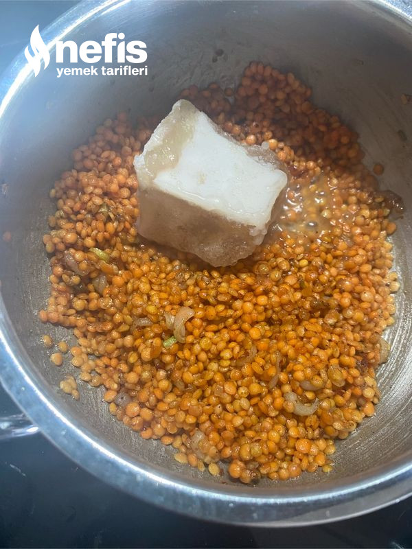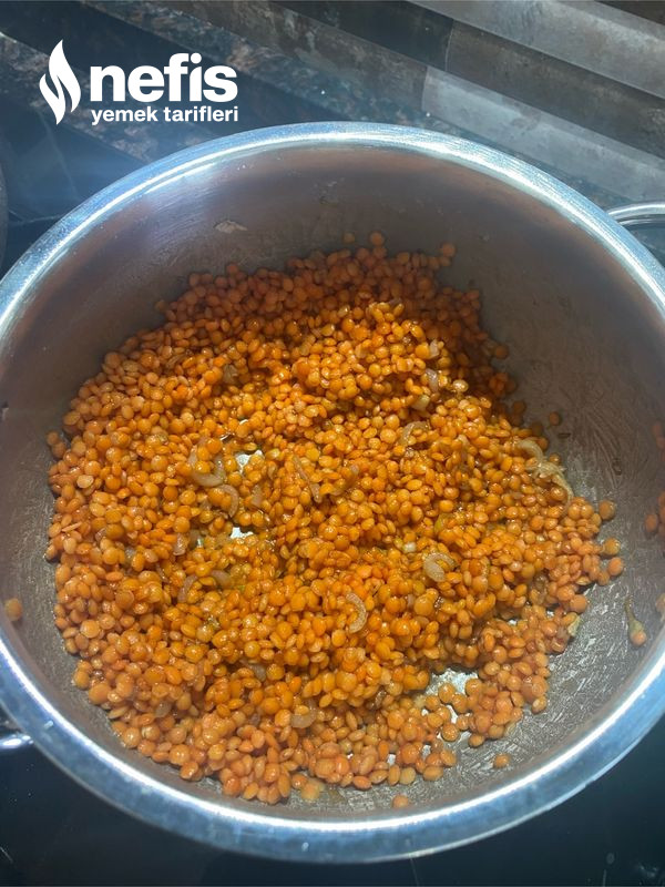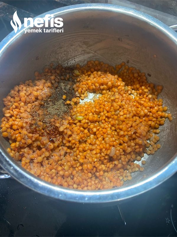 - Soğanları ve mercimeği kavurduğumuz unun üzerine atalım. Biraz kavuralım.
