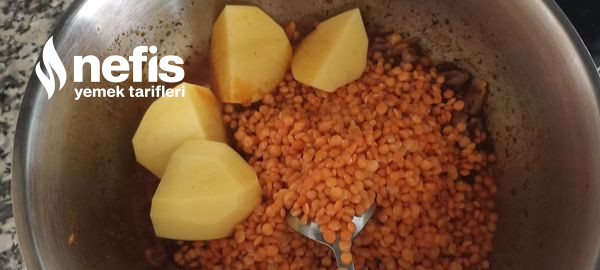 3. Yıkanmış mercimeği, limon tuzunu, olağan tuzu ekleyip kavurun ve su ekleyin patatesi soyup 4-5 kesime bölün ve içine ekleyin ve gereğince üstünü geçecek kadar su ekleyin.