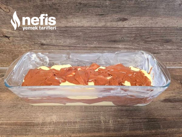 - İki hamur da hazır olduğunda kakaolu hamurun yarısını yemek kaşığıyla kalıba dökün. Üzerine vanilyalı hamurun yarısını ekleyip düzeltin. Kalan kakaolu hamuru üstüne koyup kalan vanilyalı hamurla üzerini örtün (4 kat çıkmanız gerekiyor)