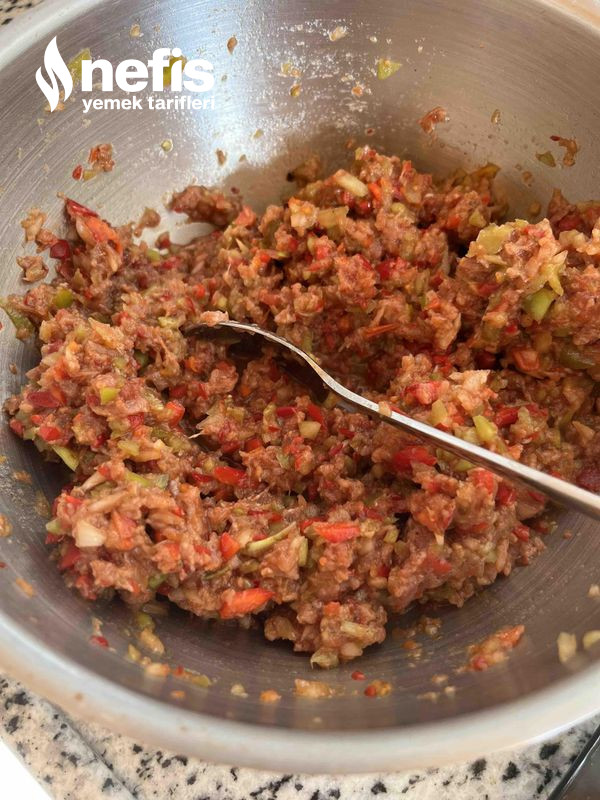 - Bu sırada kıymalı harcı hazırlıyoruz. Soğanı, kırmızı ve yeşil biberleri ufak ufak doğrayıp domates rendesini de üzerine ek ediyoruz. Baharatları sıvı yağı ve kıymayı da ekleyip güzelce karıştırıyoruz.