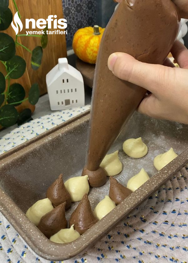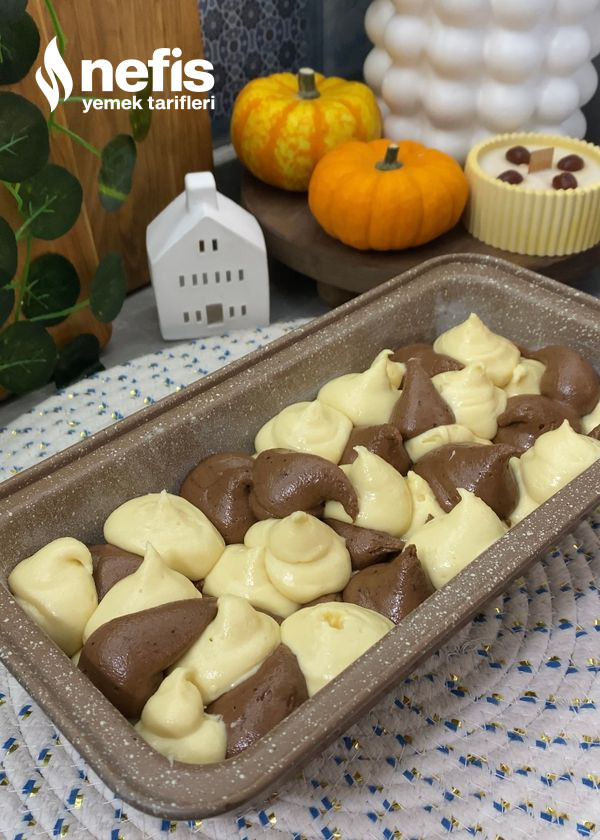 8. Hamurun yarısını öteki bir kaseye ayırın ve içine 2 yemek kaşığı kakao ekleyip karıştırın. Kek kalıbına sıkma torbası yardımıyla yahut kaşık yardımıyla dökün.