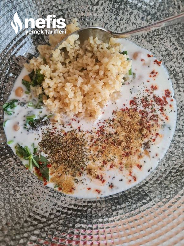 - 3 yemek kaşığı haşlanmış bulgur (pişmemiş olarak 1,5 yemek kaşığı)