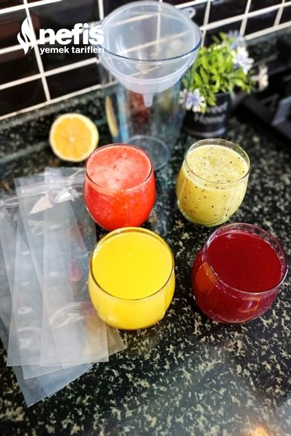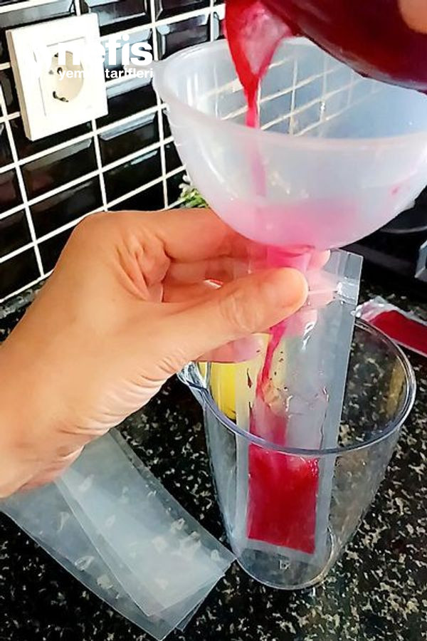 - Meyve sularımız hazır olunca küçük bir huni yardımıyla poşetlere paylaştıralım.