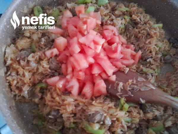 2. Kavrulunca üzerine ince doğranmış soğanı ekleyelim, kavurmaya devam edelim, yemeklik doğranmış biberi ekleyelim üzerine salçayı ekleyip karıştıralım, yıkanmış süzülmüş pirincide ekleyip, biraz kavuralım.