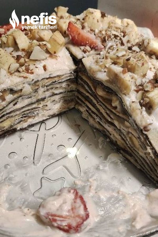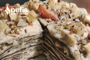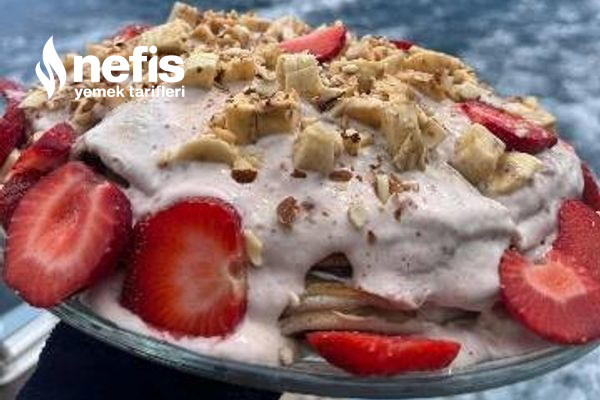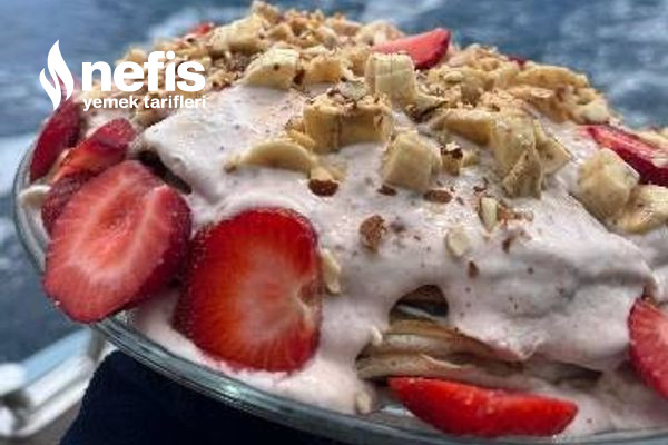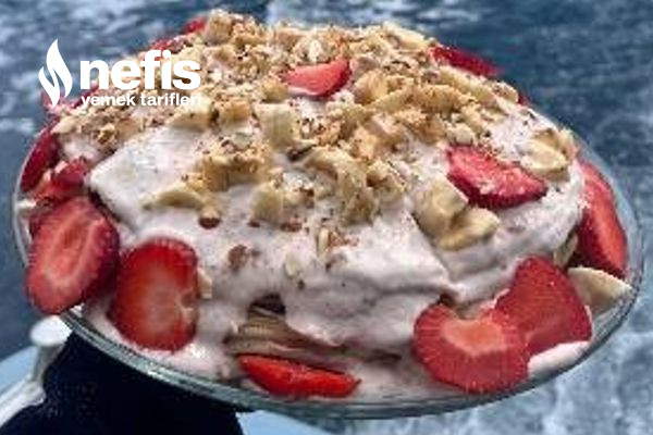 - En son üstüne kalan krema meyveler ve ceviz içi eklenir. Yaklaşık yarım saat buzdolabında bekletin. Servise hazırdır.