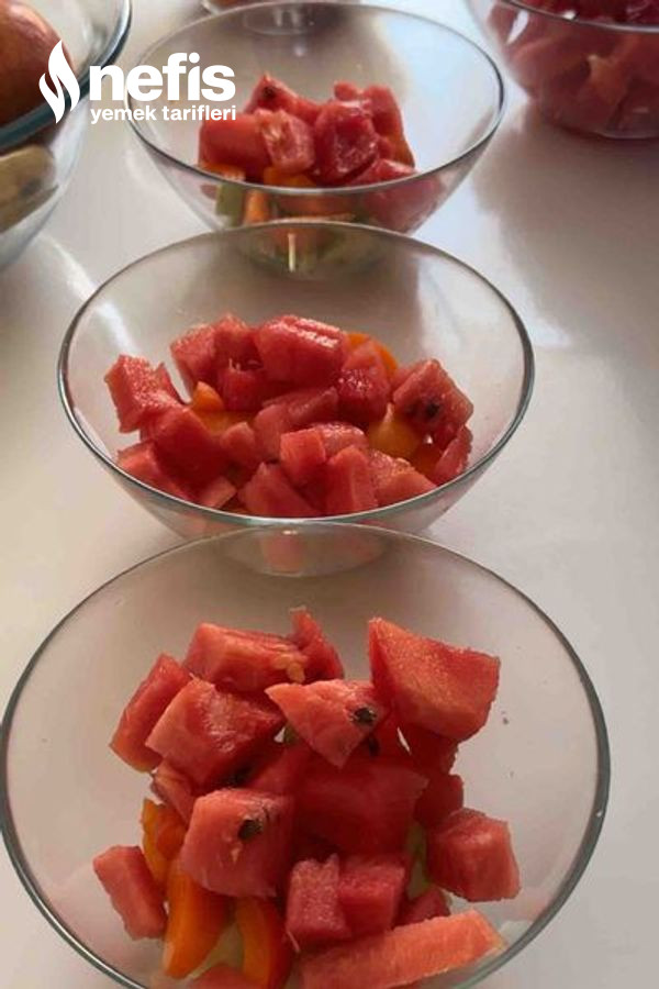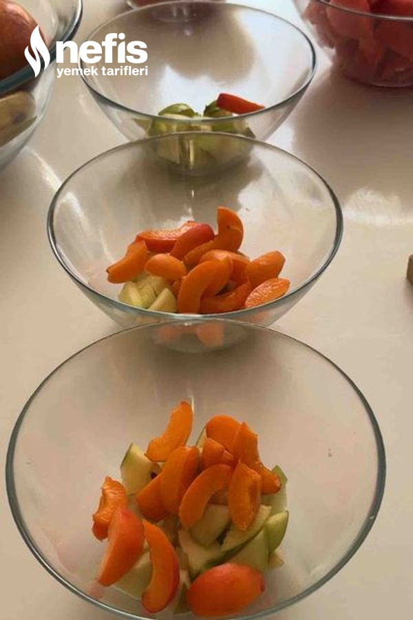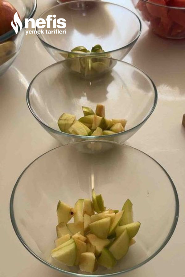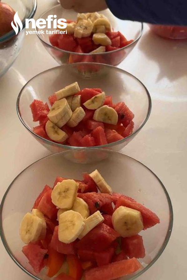 - Elmaları,karpuzu,muzları,kayısıları,çilekleri küp küp doğrayıp sunum kaselerine sırayla koyun.