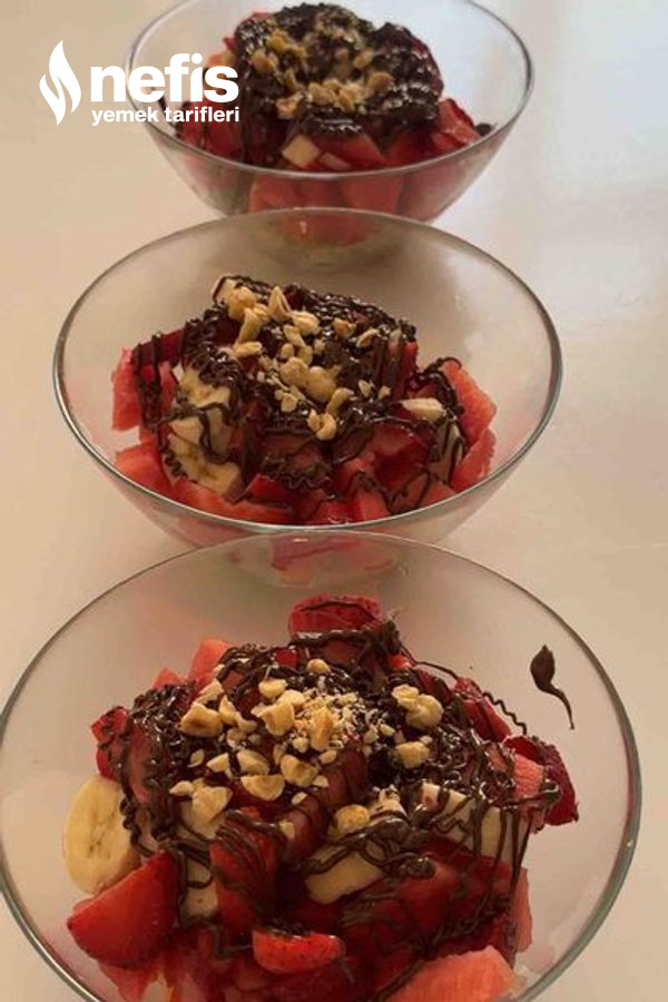 - Önce elma, sonra karpuz ,muz ,çilek, kayısıları koyduktan sonra üzerine benmari yordamı erittiğiniz çikolatayı dökün.