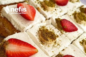 - Bu sırada krem şantiyi çırpalım ve kekimizin üzerine eşit formda dağıtalım. Pastayı dilimleyip üzerini muz, çilek ve toz antep fıstığı ile istediğimiz üzere süsleyip dolaba kaldıralım. 4-6 saat ortası dolapta bekletelim.