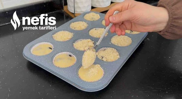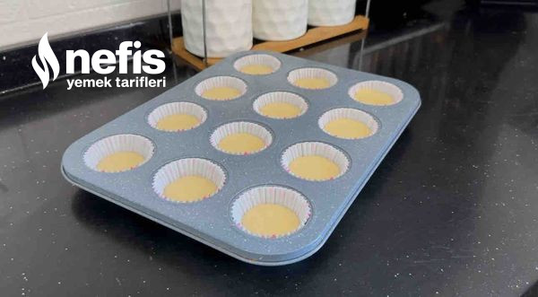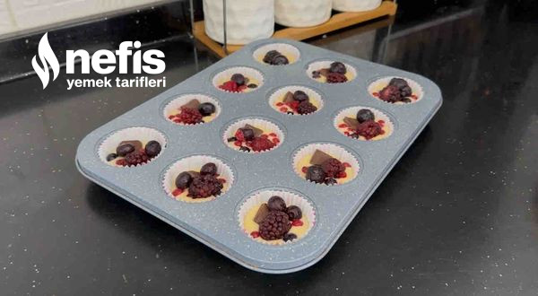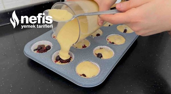 - Muffin kaplarına harcın üçte birini paylaştırıp üzerlerine meyve ve çikolata koyup kek hamurunun öbür kısmınıda üzerlerine paylaştırın.