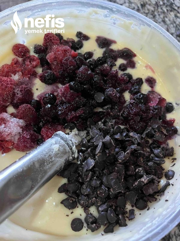3. Daha sonra süt ve kuru materyalleri de ek ederek karıştırın ,son olarak meyve ve çikolatayı da ekleyin ve yavaşça karıştırıp kaplara paylaştırın.