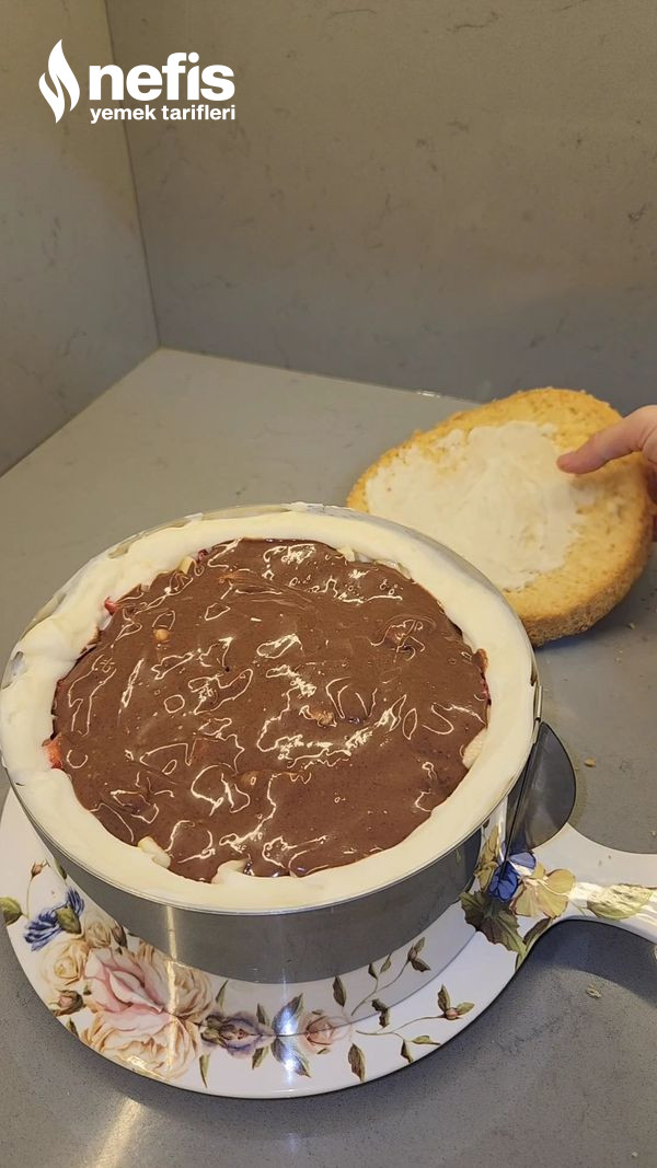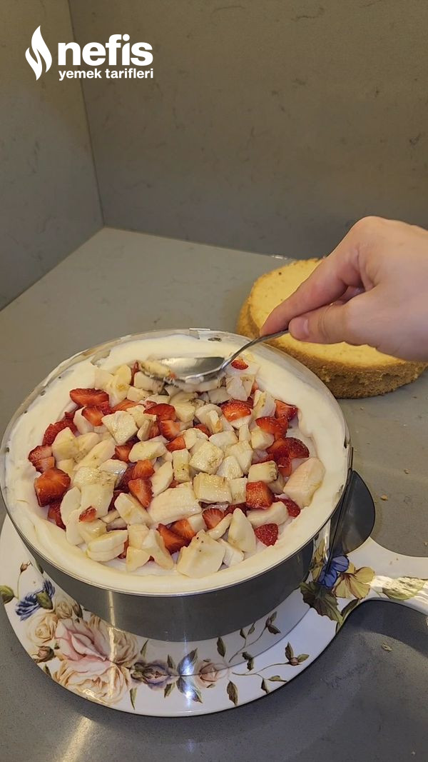- Pandispanyanın öteki kesimini koyup tekrar süt ile ıslatalım. Yeniden tıpkı halde pasta kreması koyup orta kısmına çilek-muz modüllerini koyalım.